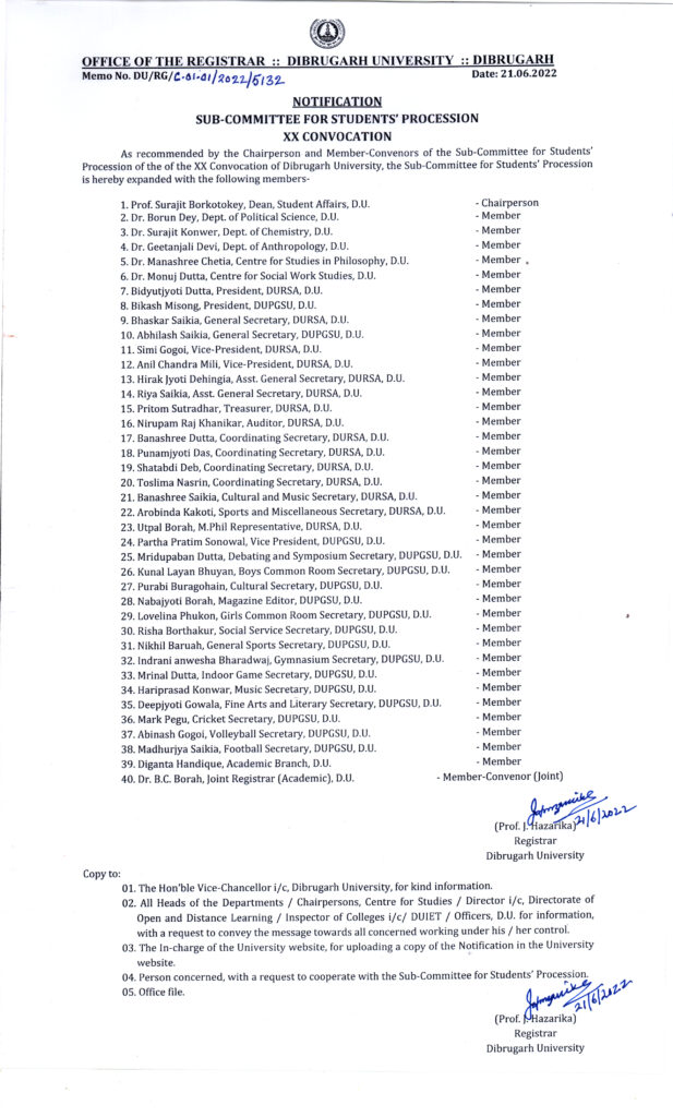 Notification regarding the Sub-Committee for Students’ Procession of XX Convocation of Dibrugarh University